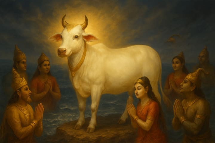 First came Kamadhenu—a divine cow that could grant any wish. She was calm, glowing, and full of abundance. The gods took her in like a blessing they didn’t expect.