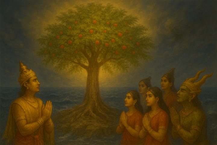 Then came Kalpavriksha—the wish-fulfilling tree. Anything you asked, it could provide. It went to the heavens, planting itself in Indra’s garden.