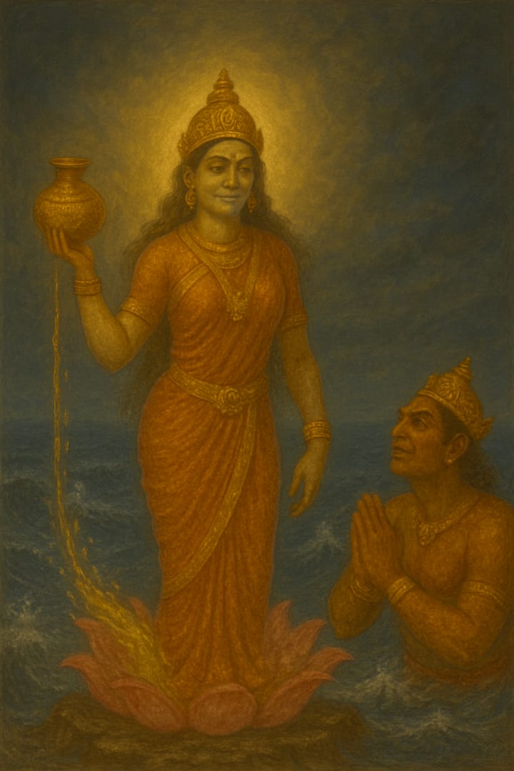 The goddess of wealth, fortune, and grace. She rose from the ocean like it had been keeping her safe all this time. Every being—god, demon, mortal—paused. The air shifted. The moment she appeared, balance started returning.
