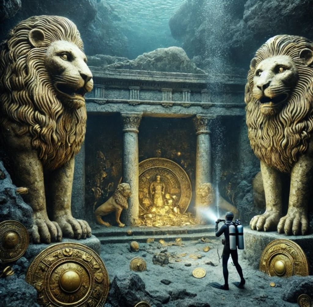 Hidden beneath the waves near the legendary ruins of Alexandria, a team of explorers stumbles upon a forgotten underwater chamber. Guarded by two majestic lion statues, the chamber reveals untold riches—gleaming shields, golden coins, and intricate statues. The site, believed to be tied to Alexander the Great, serves as a breathtaking testament to a civilization's lost glory, leaving the divers in awe of the mysteries yet to be unraveled.