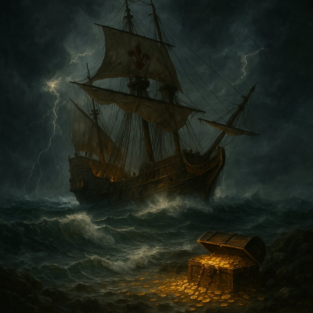 Beneath the ocean, in the depths of coral and time, resides the promise of unimaginable richesa legacy of conquest, gold, and the profound silence of history.