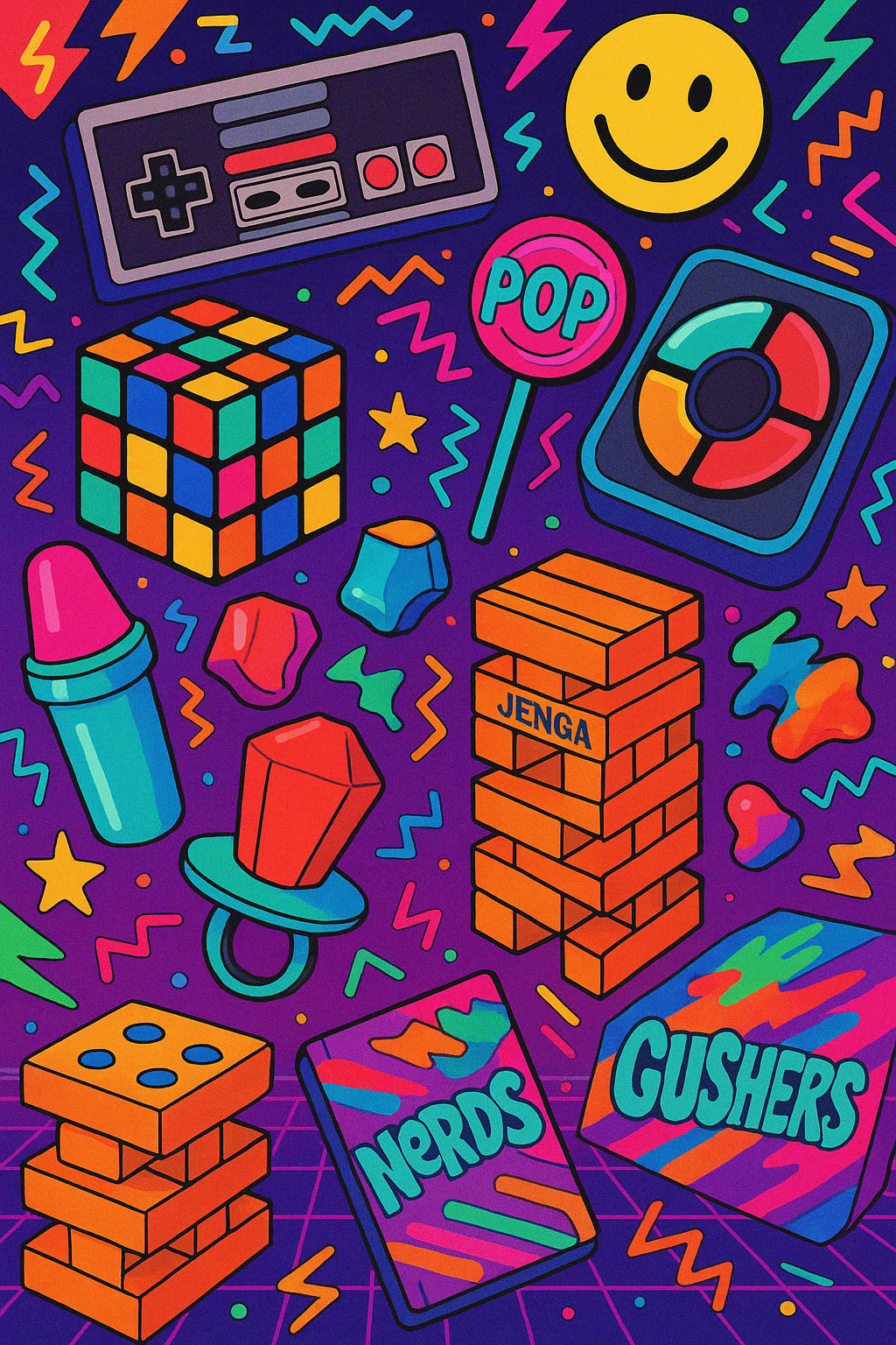 Welcome to the 1990s: a decade of Tamagotchis beeping for food, AOL chat rooms screeching through dial-up, and Nickelodeon dumping slime on anyone within a five-mile radius. For adults, it was the rise of the internet, grunge, and Bill Clinton playing saxophone on late-night TV. For kids, though, the 90s were defined by two forces of nature: board games and candy.