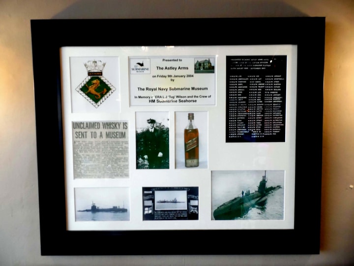 On Christmas Eve, 1939, some of the crew of the submarine HMS Seahorse were enjoying Christmas drinks at the Astley. One of their number, twenty-three-year-old Leonard 'Tug' Wilson, won a bottle of Johnnie Walker whisky in the Christmas raffle. As the Seahorse was going out on patrol on Boxing Day, the young prizewinner asked the landlady, Lydia Jackson, if she would keep the whisky safe until the submarine returned from patrol early in January. She happily obliged.