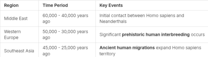 The first meetings happened in places like the Middle East and Western Europe. These areas were like bridges for ancient migrations. They allowed Homo sapiens to enter lands once home to Neanderthals.