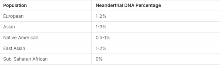 Most people outside Africa have 1-2% of Neanderthal DNA in modern humans. This amount changes in different places and groups.