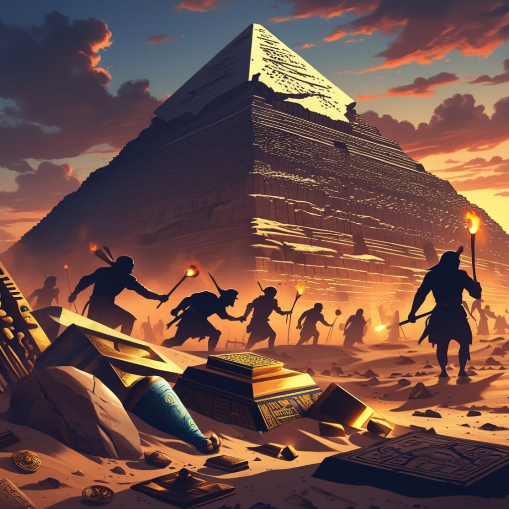 A cinematic digital depiction of the Great Pyramid of Giza during sunset, partially enveloped in sand and enigma. In the foreground, fragmented artifacts, tarnished golden relics, and dispersed burial items rest concealed in the sand. In the background, indistinct silhouettes of ancient tomb raiders escape with torches, while a concealed chamber radiates softly beneath the pyramid. The atmosphere is enigmatic, antiquated, and theatrical, representing both the magnificence and the forfeiture of Giza's treasures.