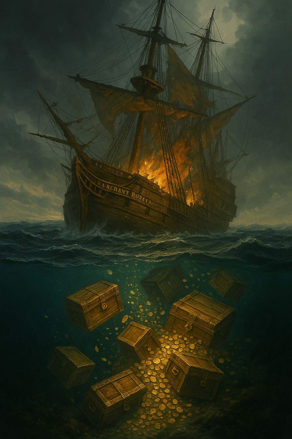 In 1641, after completing a successful trade voyage to the Spanish colonies in Mexico, the Merchant Royal docked at the port of Cadiz. There, she took on an extraordinary cargo of treasure—reportedly including 100,000 pounds of gold, 400 bars of Mexican silver, and countless pieces of jewelry and coinage. This cargo was being transported to Antwerp, Belgium, as payment for Spain’s debts.