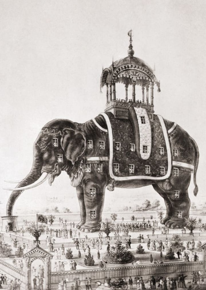 There was this other great attraction , a hotel. The Coney Island Elephant Hotel, also known as Elephantine Colossus, was a massive building shaped like an elephant, located at Surf Avenue and West 12th Street in Coney Island, Brooklyn. Built in 1885 by James V. Lafferty, it stood 122 feet tall and was made of wood and tin sheeting. It housed a hotel, concert hall, and even a brothel, attracting tourists with its bizarre architecture and rooftop views accessed through a staircase in the elephant's leg.