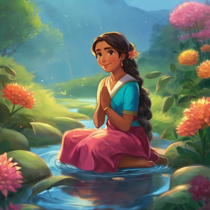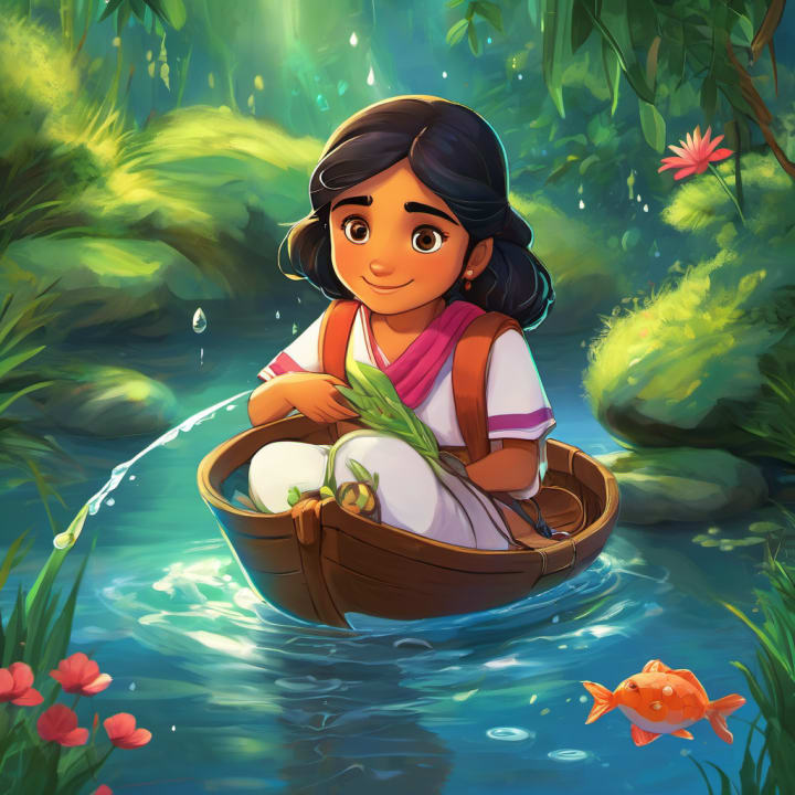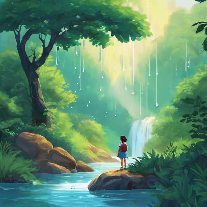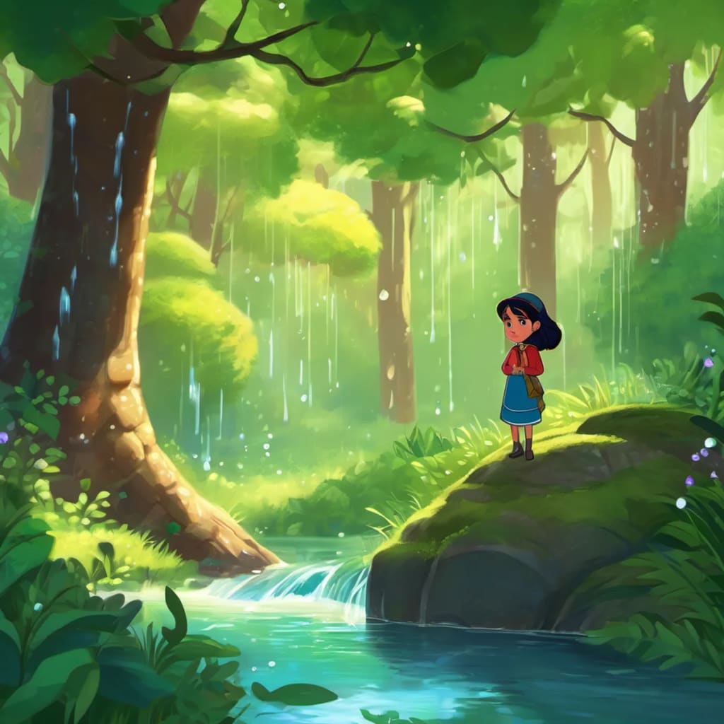 Once upon a time, in a magical forest, there lived Rani, an adventurous 8-year-old girl who loved exploring and making new friends. Rani had a special gift - she could talk to water. Yes, she could communicate with rivers, lakes, and even tiny droplets of rain. It was a secret only known to Rani. One sunny afternoon, when Rani was strolling near the sparkling river, she noticed a little droplet, crying all alone on a leaf. Curious and concerned, Rani approached the droplet and asked, "Dear droplet, why are you so sad?"
