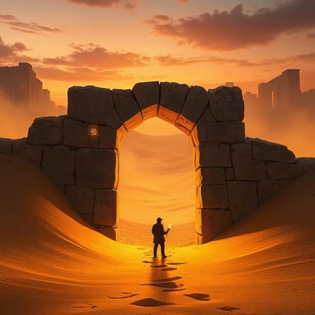 Silence fell across the desert like a velvet curtain. The air grew unnaturally still. And then — a low rumble beneath her feet. Sand slid away in rivers, revealing the full doorway: ten feet tall, carved from obsidian, and cold as ice. A symbol glowed on the top keystone — the broken crown.