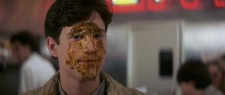 During Evil Ed's werewolf transformation sequence, actor Stephen Geoffreys was heavily in makeup when the fx's team poured a thick-saliva like solution into his mouth. This was to give him a drooling effect on-screen, unfortunately they realized too late it was glue and was actually sealing the actor's mouth shut!