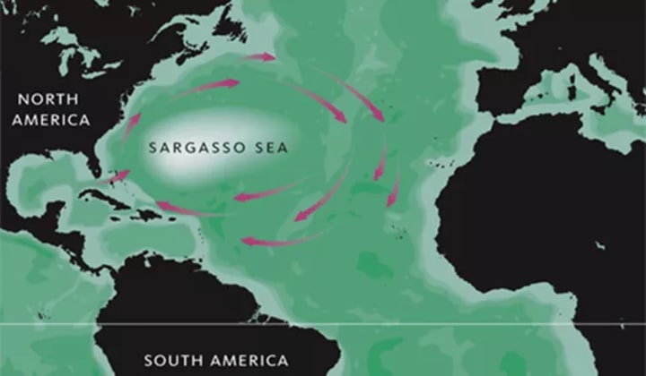 The only "sea" without shores, the Sargasso Sea is a region in the middle of the North Atlantic Ocean that is surrounded by ocean currents . These currents deposit marine plants and garbage into the Sargasso Sea, causing it to be full of Sargassum, a genus of dense, brown, invasive seaweed. Because of the seaweed buildup and the isolation created by the currents, the sea remains eerily warm and calm, despite being surrounded by the freezing and choppy waters of the Atlantic Ocean.