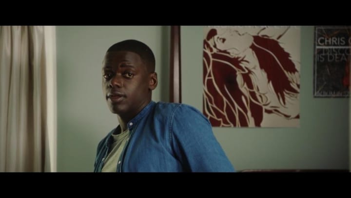 Try contrasting the one above this text to the one directly below it. What is the difference between the expressions in their extremity and why would we be wrong to suggest that the close-ups are there to show the extremity of emotion? How is Jordan Peele trying to establish a style whilst keeping the meaning behind it a secret? How will it have an impact on the way an audience reacts to his next movie?