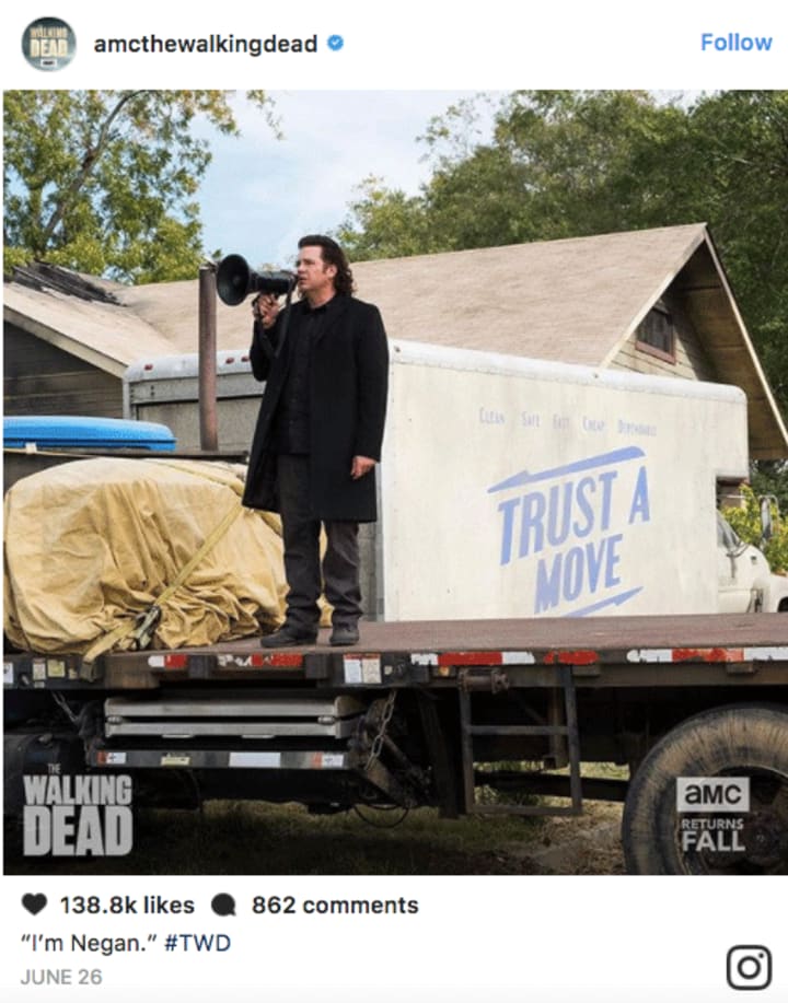 A cryptic image appeared on the social media account, which show's McDermitt's Eugene and his megaphone from the Season 7 finale — “Welcome to the first day of the rest of your life." Before you all boo, hiss, and comment with the snake emoji, some fans have noticed a very interesting detail away from the caption of "I'm Negan."The truck in the background bares the name "Trust A Move," and shows two arrows pointing in opposite directions. Getting particularly meta and overthinking things, could this hint at Eugene's dual allegiance and should we "trust" his "move" into Negan's camp is for the greater good?