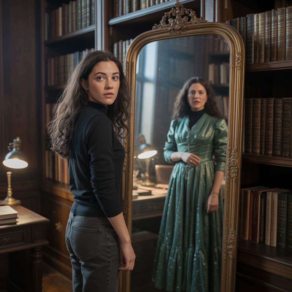 The room behind her was the same, down to the flickering lamp and crooked picture frame. But the girl in the mirror was older, with streaks of silver in her hair and a scar across her brow. Her eyes, though… her eyes were identical to Amelia’s.