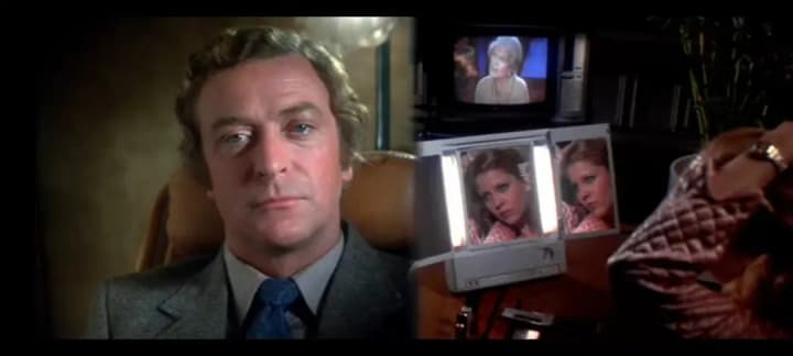 In the classic razor's Edge, Parma gives Blake a split screen while he talks on the phone, while Michael Caine's doctor watches a TV show. A transgender interview with Nancy Hart was on, and Blake ended the call, sat down in the mirror, looked at himself and watched at the same time, and the double perspective of Blake and Dr. Elliott watching the same TV show was revealed to the audience. Meanwhile, on TV, "Do you like to play the traditional role of father", "I have always been a supporter of heterosexual relationships", the sketch of a few lines, coupled with the gaze of Elliot in the split screen, and even Blake in his dressing up, all subtly alluded to the themes of patriarchy and cross-dressing.