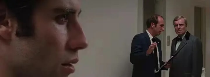 After being questioned at the hospital and experiencing distrust from the police, Terry, who saves Sally from drowning, enters a chaotic hallway. At this point, Parma cracks terry's profile into focus and occupies the left side of the screen, while the two police officers who are whispering to Terry are placed on the right. The narrator, as the subject, is compressed into the foreground, while Terry, as the passive listener, occupies the foreground. The back-and-forth inversion of the subject-object relationship is skillfully combined with parma's "peep" element, and at the same time amplifies terry's feelings of finding the police mistrustful and even suspicious.