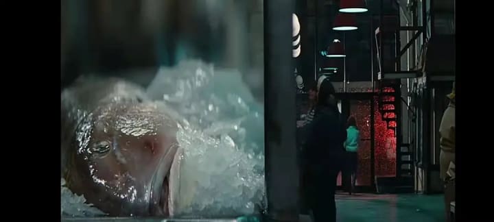 The second set of split-focus treatments in "The Line" occurs in the scene where Sally is followed. Tracker in the close shot of Sally photos with the vision of an elevator Sally constitute a very perfect crack prime lens, it is also a "potential peer" is the most perfect play a scene, is both intuitive to show the whole process of the tracker peep at Sally, at the same time, with the potential peer refers to Sally will face the next crisis. Crack focal processing here is far from the end, in the process of tracking the woman, there is a group of dead fish sold in the market and blurred woman moving crack focal lens. The murder tools slowly picked up and the woman's back just constitute the most intuitive processing of snooping and even tracking, while the picture of dead fish more strongly indicates the crisis to be staged next.