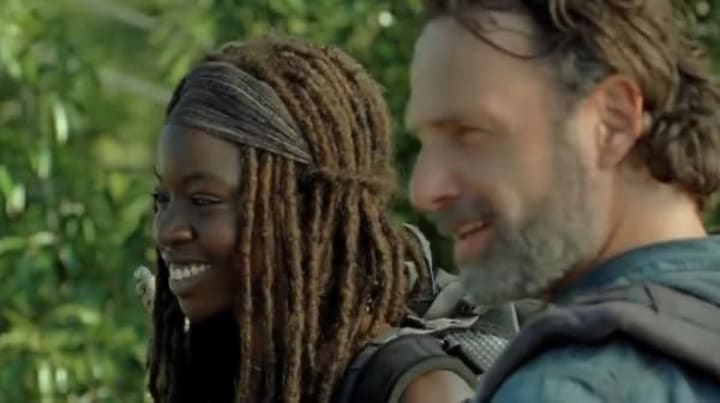From the look on their faces, they appear to be somewhat relieved — happy in fact. Michonne and Rick's demeanor hasn't improved yet, but this new image of the two of them smiling seems to imply that they'll receive some good news or, at the very least, stumble across something that puts a smile on their face during Season 7B.