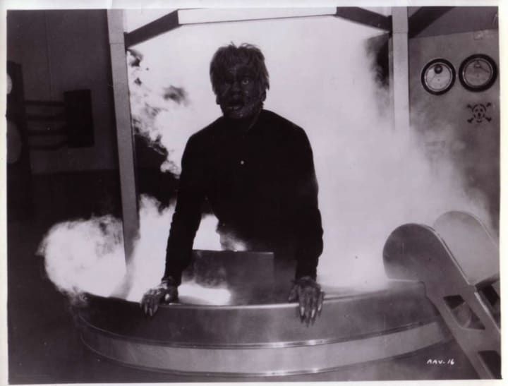 Levin injects the stuff himself so he can get his killing frenzy up, and Jekyll and Hyde-style transform into the "Atom Age Vampire," a gnarly, snarling midnight monster show ghoul that kills people. But not nearly enough to be really entertaining.