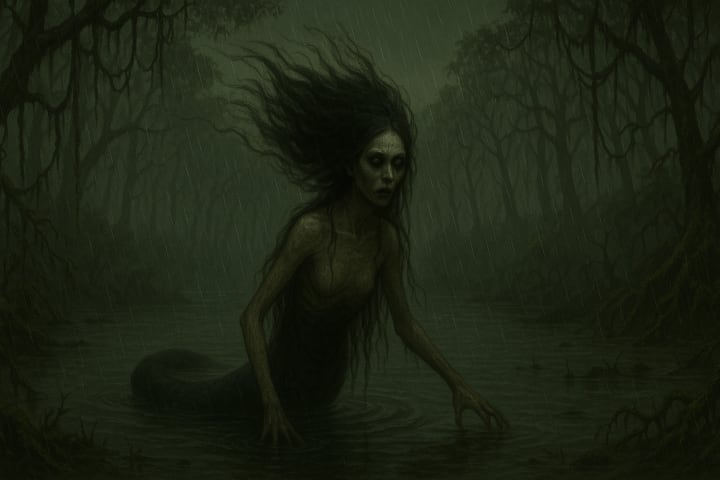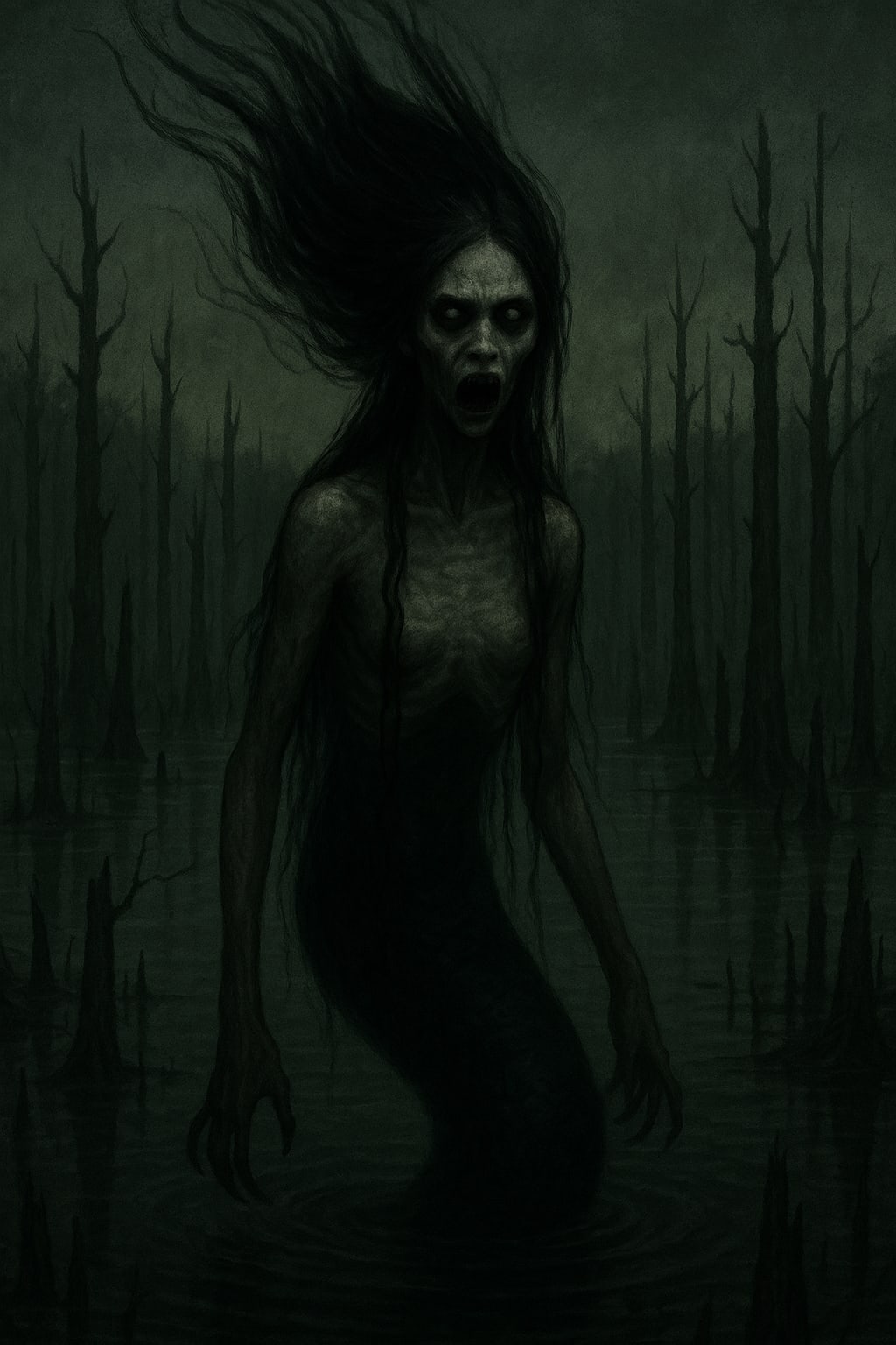 The bravest hunters tell of seeing Banuaya herself — not a ghost, but a guardian spirit, part woman, part eel, with jet-black hair that floats in the air and eyes like sunken pearls. She emerges when someone dares disturb the water, especially during the sacred nights of bulan gelap, the dark moon.