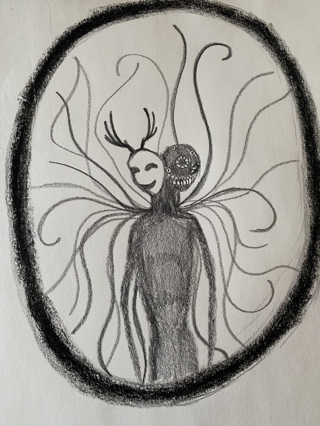 The mirror showed a reflection that wasn't my own. What stared back at me from beyond the glass could have ben described as an eldritch monstrosity by some, nightmare fuel by others, grotesque by most, and to a select few, awe inspiring. Inky black flesh stretched over a skeletal frame, two heads on the same neck; one wearing a white actor's mask with empty eyes and vacant smile in addition to a set of antlers resembling those of a white tail deer, the other an amalgamation of mouths, teeth, and eyes. Tentacles branched out from its back, and for a moment, it seemed as though they were moving.