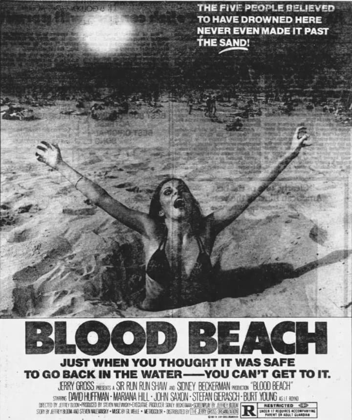 Director Jeffrey Bloom kept things simple: people are being sucked beneath the sand on a Los Angeles beach. The authorities — led by John Saxon’s weary police captain and Burt Young’s blustery sergeant — struggle to explain the disappearances. David Huffman and Marianna Hill play locals caught in the middle.