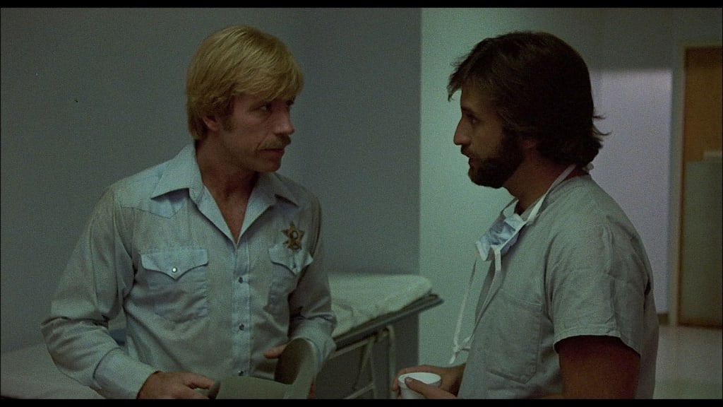 A mentally dysfunctional (to put it mildly) psychopath, "John" (Brian Libby), goes on a killing spree, murders his mother (or I guess that's who she's supposed to be), and is gunned down for all of his trouble. Chuck, as small-town Sherriff Dan Stevens, is there, with his three-hundred-pound stand-in for Don Knotts, "Deputy Charlie" (Stephen Furst), to kick psycho ass and take names. He almost gets his head blown off for the trouble.