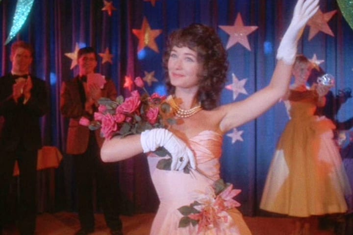 Ghost Mary Lou can commit murders but it cannot win prom queen. Thus, Mary Lou sets her sights on Vicki and slowly begins to possess the popular young student. In a legitimately terrific scene, Mary Lou takes possession of Vicki's body by pulling her into a chalkboard which morphs into a swirling greenish black roiling cauldron, a vortex that swallows up Vicki. Then, Mary Lou as Vicki emerges from the trunk in the basement. How did she wind up in a trunk in the basement? I don't know and the movie doesn't know. How does Vicki suddenly have a full wardrobe of 50s clothes? It's best not to ask questions.