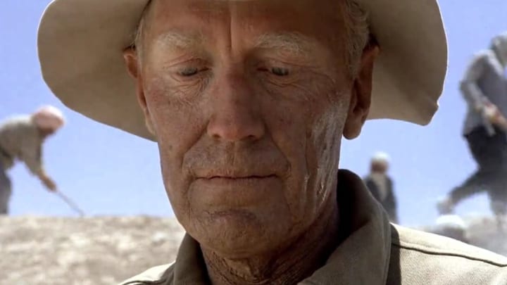 An elderly white archaeologist is called to come to a place where some small items have been found. The old man goes and when he reaches into the cave where these small items have been found, he finds one more, a small idol with what appears to be the face of a dog or a dragon or something. We don't know who this old man is at this point, but we stay with him as he goes to a café and has some tea. He's shaky, he takes pills for what I assume is a heart condition. He appears shaky though whether that is due to having found this idol thing or because he's very old and has been working in the hot sun all day, is unclear.