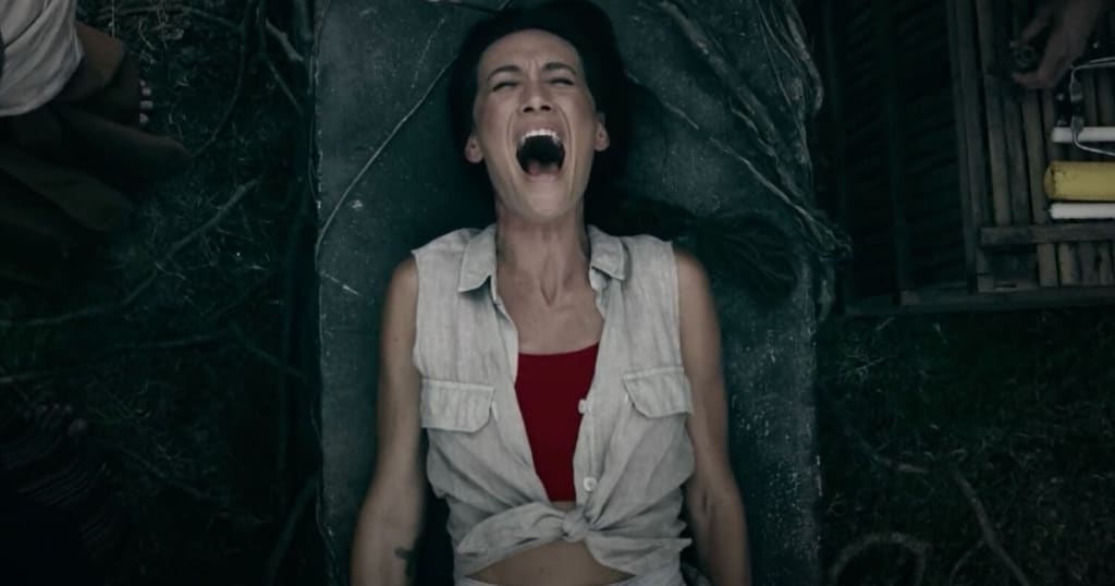 On a remote island in Thailand, Christine (Maggie Q) and Neil (Luke Hemsworth) wake up in their vacation villa, with no memory of what happened the night before. It seems they’ve had too much to drink. When retracing their steps, Neil looks into some of the previous night’s footage he made with his video camera. On the screen, they see themselves in a dive bar, being wasted and seeing their waitress spiking their drink with some mysterious concoction. Fast-forwarding to the end, they see themselves having violent sex, which ends with Neil choking and breaking Christine’s neck, and burying her body. All of this naturally prompts some questions. Christine soon begins puking grass and starts having the occasional hallucination. Christine ponders the nature of her husband and the event. Did this really happen or is it a premonition of the future? Did she survive somehow or is this some warped purgatory?