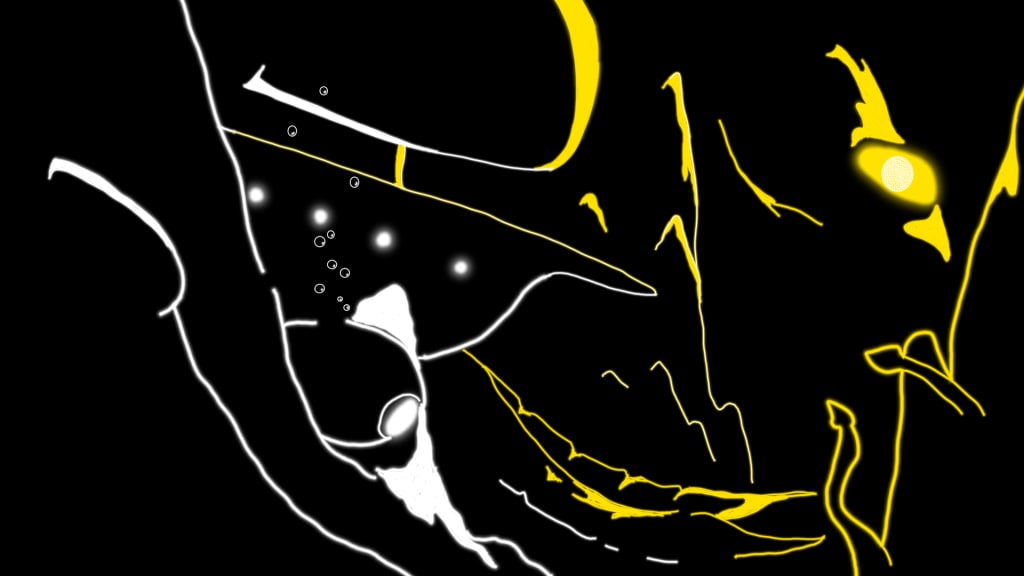 Revisiting the window, Davis reeled back and nearly fell over on his leg again. What was looking back at him was a round, white sphere with odd, smaller lights blinking and watching him. Captain Davis stood perfectly still, besides the trembling. He held his breath save for the short bursts that escaped from genuine trepidation. Davis was petrified, staring down the bizarre thing that kept its gaze so intensely before sinking down and away. Davis rushed to the window to see where the thing went. Below him, the sea floor shifted and turned and slithered its way down the trench.