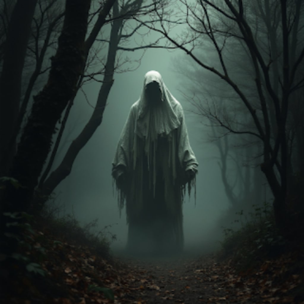They moved cautiously toward the source of the voice. Suddenly, a pale, ghostly figure emerged, floating in the air. A shiver ran through Kira as she stared in horror, but Raouf stood beside her, determined.