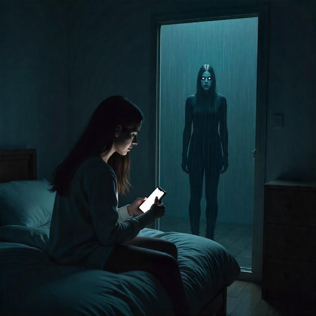 Still her room. Still her. But this time, the reflection was shaking. Crying silently. And the figure behind her? Closer. Almost visible. A silhouette of something tall, thin, with no face—just glitchy static where the eyes should be.