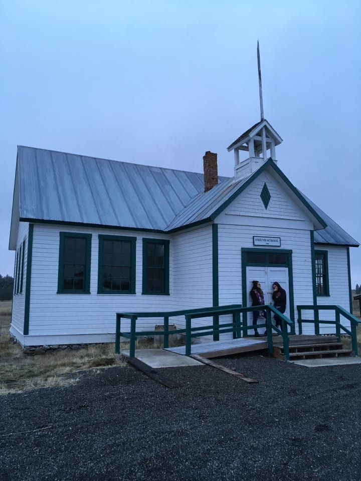 We did not get out of the car because it looked like someone was still living there, and this is the type of area in Oregon where, if you step foot on someone's property, they shoot you. Further down the road, we discovered the one-room school house the town used to use. Inside was an old piano, desks, and chalkboards.