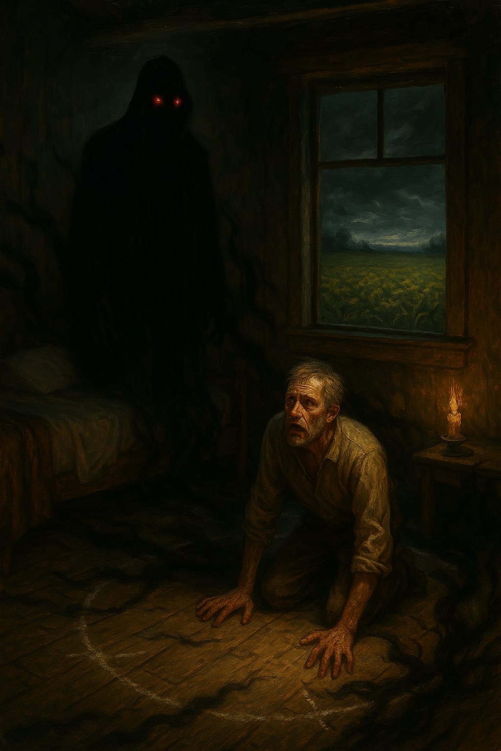 The night it came for me was the night I realized the price I was paying. The sky had darkened without warning, the clouds turning black as if they were collapsing into themselves. I heard the sound before I saw the shadow—an odd crackling, like fire racing across the sky. And then, in an instant, the stranger was there, standing at the foot of my bed, his eyes glowing a deep, hellish red.
