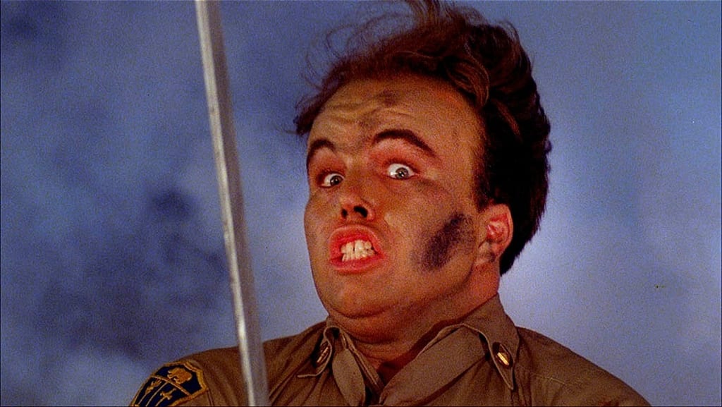The assembly is rounded out by Colonel Kincaid, played by Charles Tyner, "Sarge," played by R.G. "Louis Vendredi" Armstrong (another bad movie veteran of yore), and the redoubtable Claude Earl Jones, who was in Porkys and who licked Tucker's ear as an incestuous-minded uncle in the toilet bowl Eighties Troma sex comedy Hollywood Zap. Finally, we have the academy chaplain, Jameson, played by Joe Cortese. (I suppose one shouldn't forget the creepy German pseudo-S.S. Man "Hauptmann," played with caricature-like grace by Hamilton Camp.)