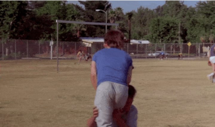 Coach Schneider is barraged with "balls," has his bare backside whipped with towels, and is eventually slain by Freddy/Jesse. When you look a little deeper into the whole "hit by balls" connotation, towel whipping is 100 percent homoerotic.
