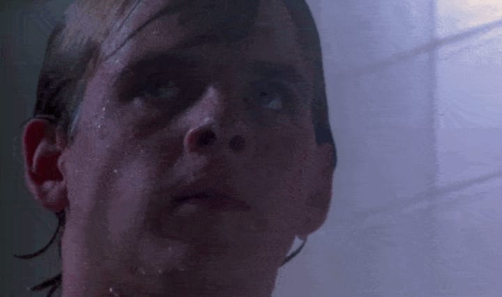 One element that was most definitely out as 'gay' was the uncomfortable S&M scene. Part of the plot (randomly) takes an insomniac Jesse to visit a gay bar after curfew. New Line's boss Bob Shaye demanded a part in the film (despite being a reportedly awful actor), and as a middle finger to the exec, Sholder cast him as a leather-clad bartender with an outfit courtesy of "The Pleasure Chest." Jesse meets with the school's Coach (Marshall Bell) and there is the infamous shower scene.