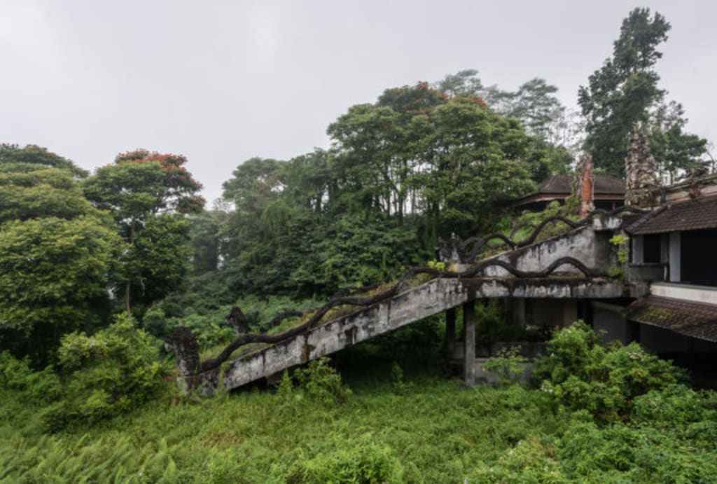 Perched above the foggy highlands of Bedugul, the Ghost Palace Hotel (officially PI Bedugul Taman Rekreasi Hotel & Resort) is a decaying monument to greed, political corruption, and ghostly legend. It began in the early 1990s as a side project of Indonesia's then-authoritarian leader President Suharto's youngest son, Tommy Suharto. Thought out as a high-end retreat overlooking Lake Buyan, the hotel was showy Balinese in design: stairways lined by snakes, marble floors, and balconies with floor-to-ceiling windows overlooking sensational views of volcanic peaks and rice paddy fields.