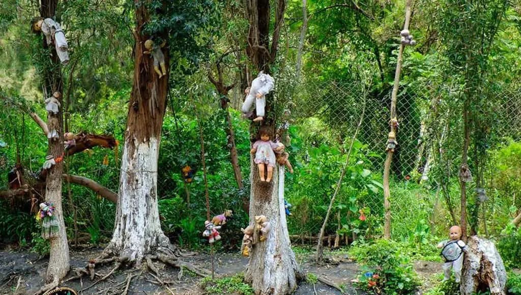 At twilight, she came upon a clearing, and there, amidst a grove of ancient trees, she found something both haunting and mesmerizing. Rows of dolls, their lifeless eyes staring into the void, dangled from the branches like eerie ornaments. These were the dolls of lost souls, suspended in eternal limbo.