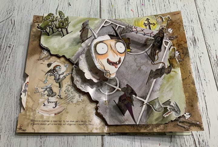I read and played with this book for years after purchasing it. You can tell it's well-loved by the misfolded bat that refuses to let me close a cubby door, the Headmistress's body torn from the open front door, and the creased and crumpled report card pulled from the last page too many times. I opened this book whenever I could — before school, after school, and yes, even before bed. This was my favorite funny, spooky, gory, and disgusting bedtime story.