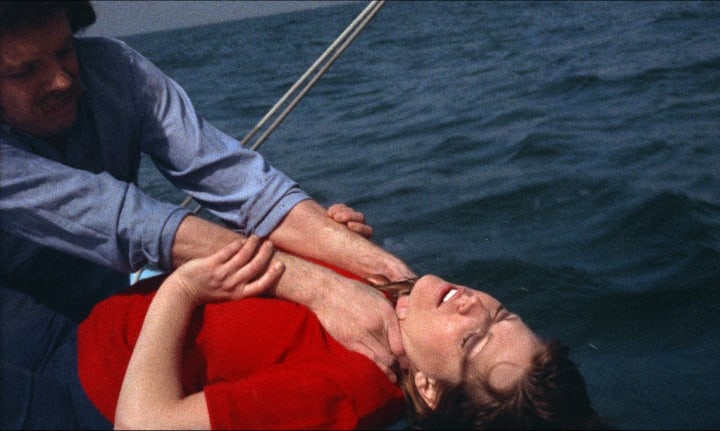 Mark snaps after hearing his brother getting mentioned, and he strangles her. He throws her over the boat, and he sails back on his own, lying to the man who let him rent the boat, that he had dropped her off somewhere else, after a fight.