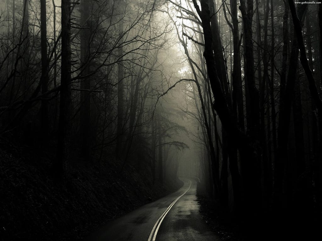 Hoping not to upset her more I continued. "When I woke up, the first thing I saw was a road with nothing in the far distance. The road reminded me of a tunnel that kept going on, but instead of being encased in concrete the road was surrounded by vast sequoia trees on both sides. Everything was black and grey. When I tried to speak, no sound came from my mouth. In a panic, I started screaming, which was pointless being that no one could hear me. Not knowing what else to do, I picked a direction and started running. If I had to give the direction a name, I would say backward. It was the opposite direction in which I woke up facing. Running for what seemed like 10 miles, the road didn't change, the area looked identical to where I started. Discouraged, I started to slow down into a steady walk, still passing by the duplicate setting hoping that maybe a slow pace will help me notice something, anything. Carrying on like this for another however many miles still, nothing changed. Giving up I sat and laid down in the middle of the road. I knew I was dead I just didn't understand why I was here. It felt like I was sitting there for days when 'He' appeared, to be honest, I don't know if it was a He. But to make things simple we will refer to It as He. He just appeared there. No face was seen, instead, a red hooded coat covered him. In my head, I thought who is this? and that's when an unrecognizable voice answered me in my head.