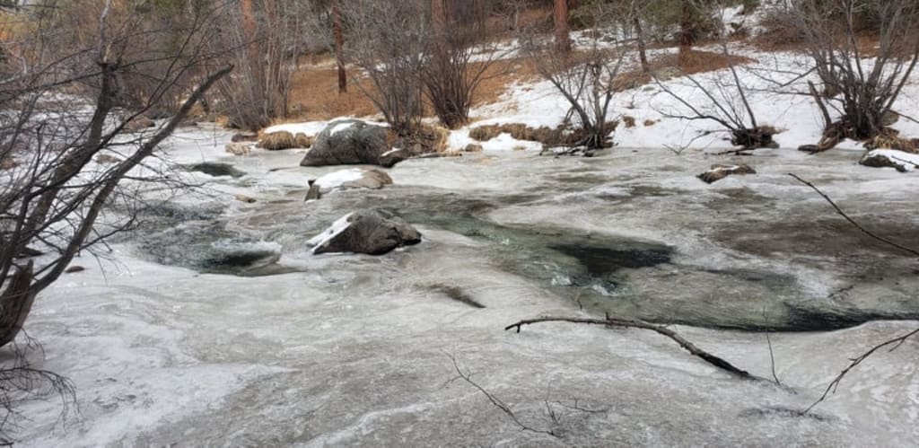Sharp winter air burned my lungs. Over the lake or around it? Over it. My feet hit it hard, my knees two rocks smashing together. I slide, couldn’t keep my momentum. I’m tripping over myself and on the approaching other side of the lake I see my brother, matted red with so, so much blood. Lifeless, steam coming from the pooling blood beneath him.