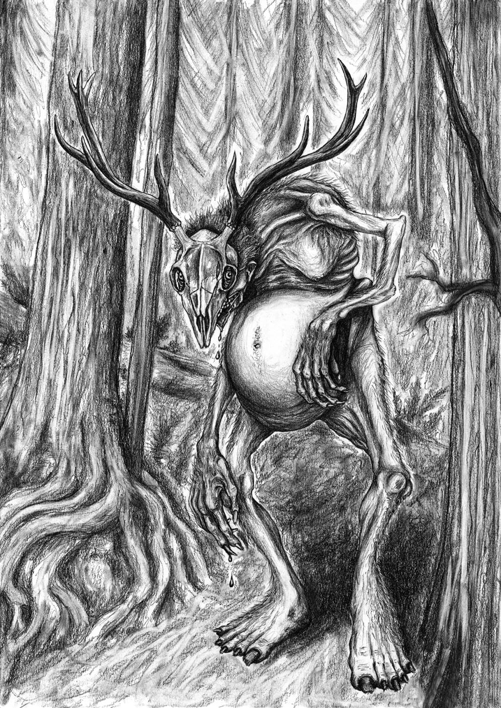 Its skin was ashen and dead, almost wax-like. Tattered and taut flesh stretched over its skeletal frame. Fragments of bone punctured the skin, piercing the desiccated flesh from within. Its head seemed to be that of a large deer’s skull, with long and proud antlers which reached up into the branches above.