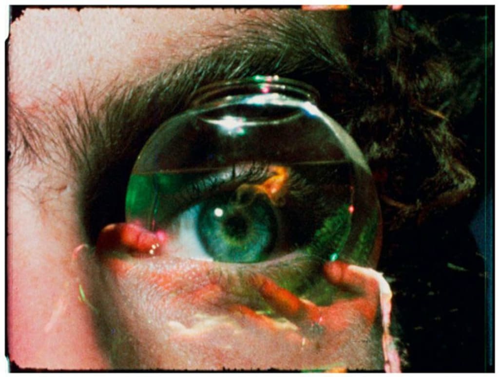 It begins with an albino, whose eyes twitch mysteriously left and right. A seated man (we can't see the head) uplifts a dagger; inauguration. The camera pans upward across a painting of a demon. Young nude men laze about on couches; the albino may be the Divine Child, Horus being born, or reborn, or the mystic spiritual entity of the ALL contemplating the world of divine male love, music, enchantment, sacrifice, offering, as troops with guns jump and run from a helicopter in Vietnam. Close-ups of the twitching eye, the spider tattoo, and the superimposed images of obscure and inscrutable occult sigils. All suggest something being BORN.