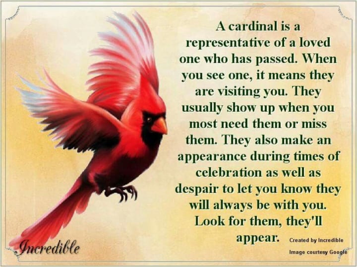 Where I live now I have heard that cardinals are all over the place. I rarely have seen these beauties untill a month ago. It was standing in front of my window, and suddenly I felt a calmness and I knew that it was my father or my loved one watching out for me. It sat there for a little while waiting for me to acknowledge it, and then it was gone. I do believe they are around whenever I am celebrating something or going through a very difficult time. It is very true. They are fascinating birds that I always enjoy when they visit.
