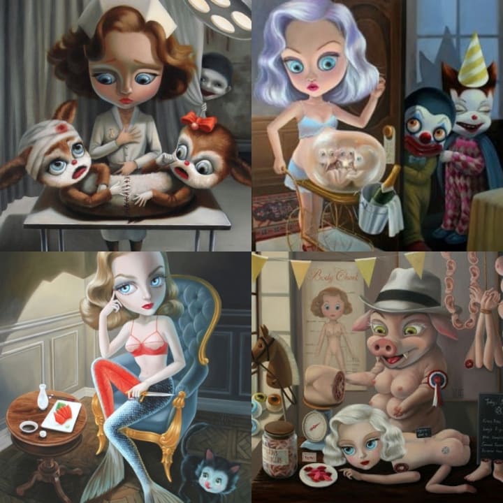 His art features dead-eyed toys and cute, ambiguously aged girls, and whilst it looks soft and colourful, there’s just something deeply unsettling. What I find particularly disturbing are the child-like girls in his work - they appear to be children but they are usually engaged in adult activities or in situations that it’s uncomfortable to see young people in.