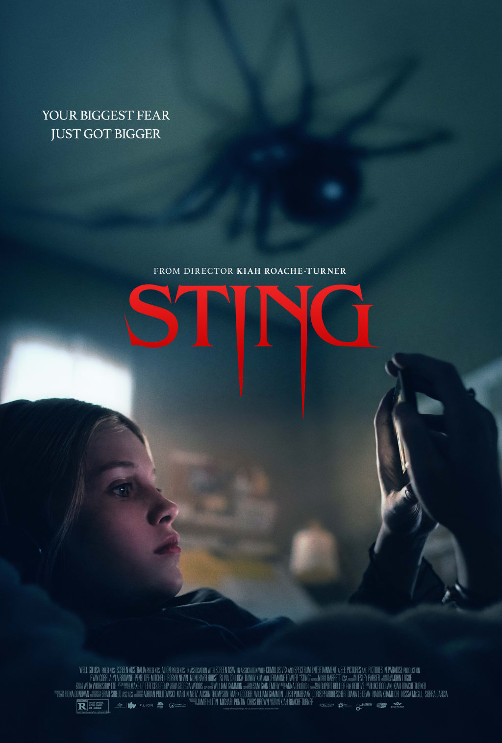 Sting is a solid monster movie. Written and directed by Kiah Roache Turner, the film builds suspense quickly, features some terrific monster movie gore and has a protagonist in Charlotte who is easy to root for. So is the cast surrounding her, specifically Ryan Corr who plays Ethan, Charlotte's stepdad and creative partner. The two work on a comic book together but this doesn't keep them from having a fraught 'not my real dad' dynamic that bubbles under the main big killer spider plot. What? Giant spider movies can't have a heart? Trust me, it's just a small part of Sting.